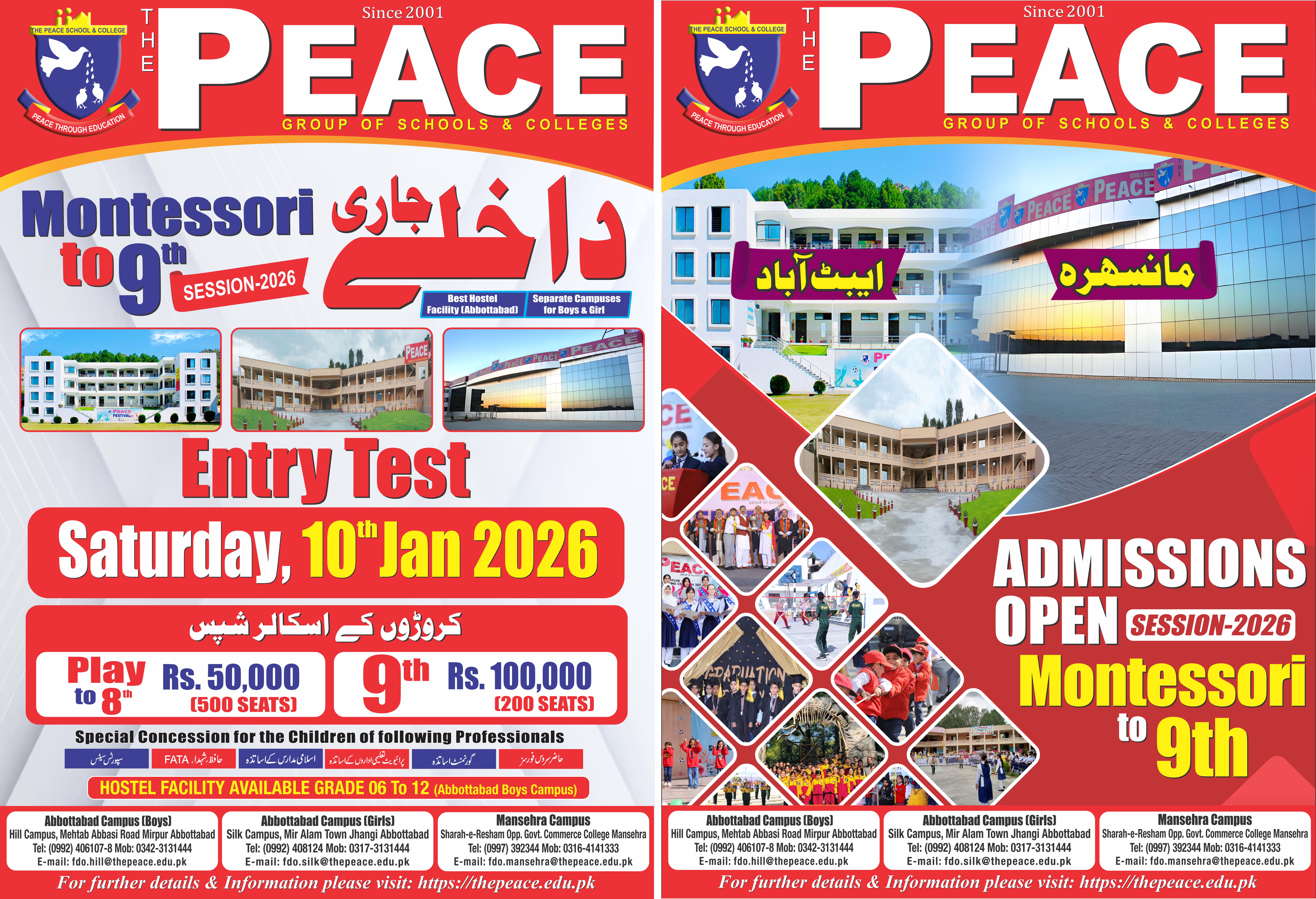 From Montessori to F.Sc, The Peace Group of Schools and Colleges is now welcoming applications for the academic year 2026! Since 2001, we have been shaping bright futures with a commitment to academic excellence and character building. With multiple campuses across 8 districts of KPK, we provide a nurturing environment where every child can thrive.